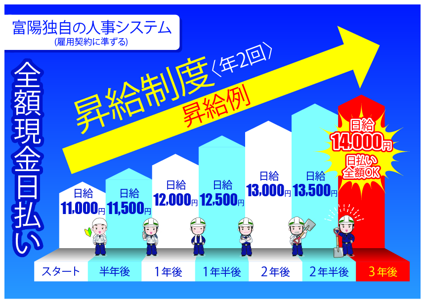- 全額現金日払いで対応しています。ご希望により週払い、月払いも対応可能です。